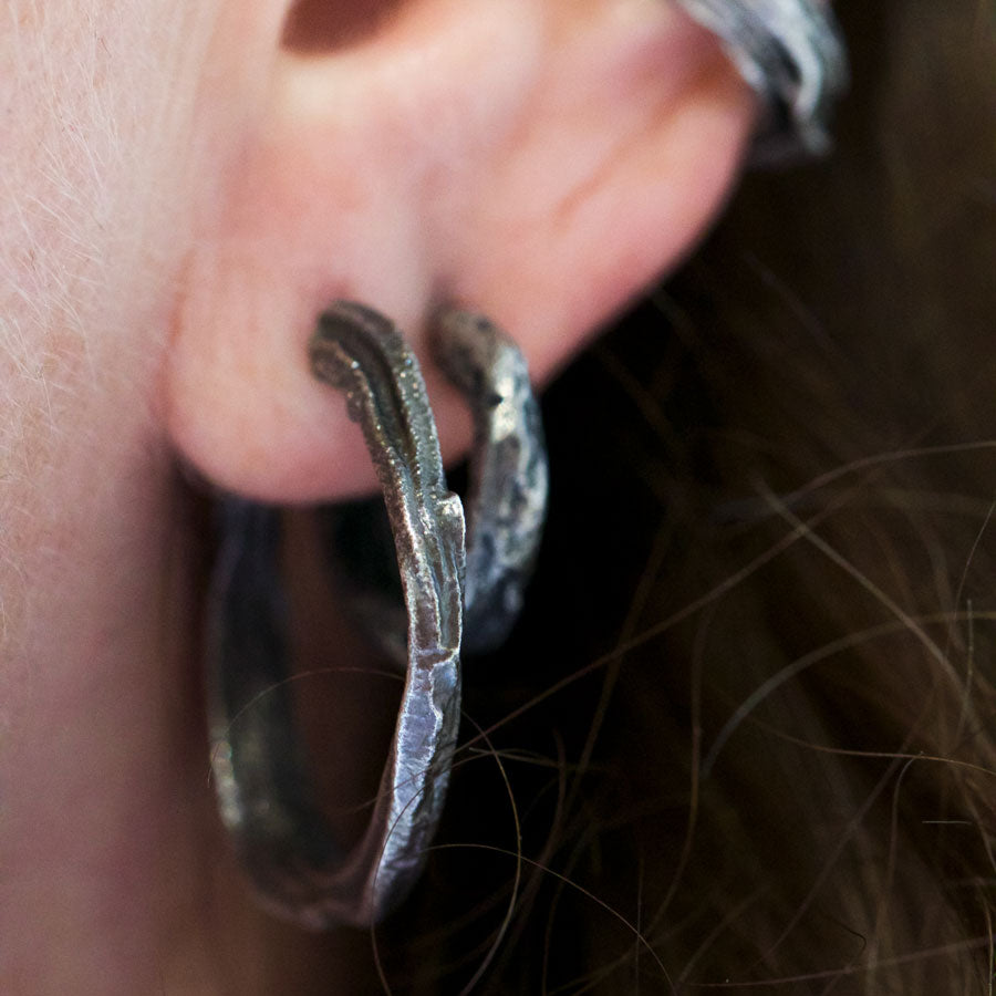 Stor variant av fusion-örhängen. Oxiderat silver.